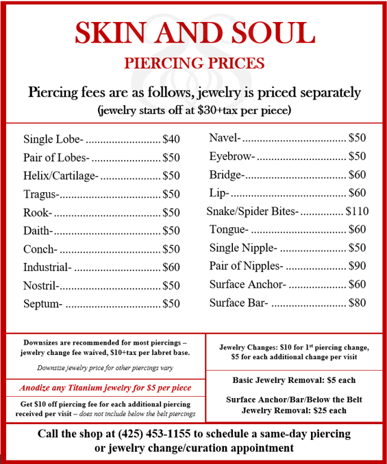 All of our jewelry for initial piercing is internally threaded or threadless. We pierce with implant grade titanium (6AL-4V ELI ASTM F 136), implant grade steel (316L ASTM F 138), niobium, glass, and 18 karat gold. Mill certificates for steel and titanium jewelry are available upon request. Some of the manufacturers we carry are Neometal, Anatometal, Blue Mountain Steel, Precision One, LeRoi, Body Circle, and People's Jewelry; all proudly made in the USA and hand polished to a mirror finish. We also have an anodizer that changes the color of titanium and niobium jewelry to almost every color you can imagine. The jewelry you can choose to be pierced with can be as unique and beautiful as you are!